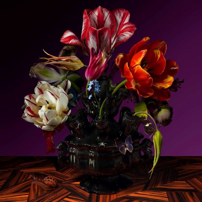 Художник собирает единую композицию из фото цветов, символизируя изобилия Рая. На его работах, мы видим единство, которое невозможно достичь на земле, только в Эдемском саду. Мы все прекрасно знаем, что например, тюльпаны цветут очень короткий промежуток времени, а для художников 17-века они являлись цветком, символизирующие смерть.